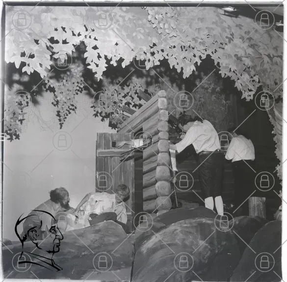 byggande, stuga, trä, hantverk, människor, arbete, inomhus, landskap, kreativitet, 1900-tal, svartvitt, scen, rekvisita, natur, detaljer, tradition, kultur, samarbete, konst, miljö, historiskt, handarbete, träbearbetning, design, installation, teater, scenografi, konstverk, grupparbete, hobby