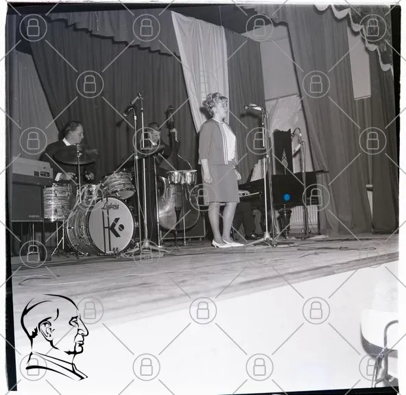 scen, musik, sångerska, band, trummor, kontrabas, mikrofoner, klänning, uppträdande, publik, instrument, svartvitt, 1960-tal, live, föreställning, artist, underhållning, kultur, musikaliskt, show, scenkonst