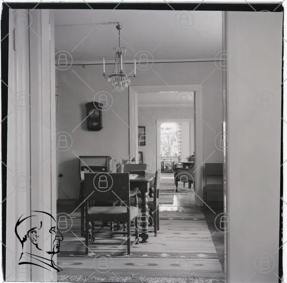 rum, inredning, bord, stolar, kristallkrona, väggklocka, matta, dörröppning, ljus, möbler, fönster, väggar, stil, heminredning, svartvitt, perspektiv, interiör, gammaldags, hemtrevligt, rummet, detaljer, design, atmosfär, klassisk, utrymme, skugga, linjer, struktur, symmetri