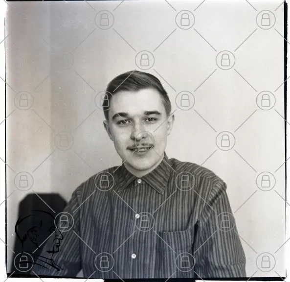 man, porträtt, svartvitt, kläder, skjorta, mustasch, 1950-tal, inomhus, leende, fotografi, retro, stil, ansikte, ungdom, klassisk, vintage, personlig, uttryck, sittande, bakgrund, enkel, stilren, mode, tidsepok, nostalgi, karaktär, detaljer, ögon, hår, ansiktsuttryck