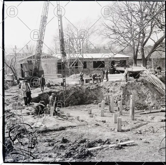 byggarbetsplats, konstruktion, arbetare, maskiner, grävning, träd, byggnader, verktyg, fundament, byggmaterial, historisk, svartvit, landskap, arbete, byggprocess, byggnadsställning, jord, byggprojekt, teamwork, industri, utomhus