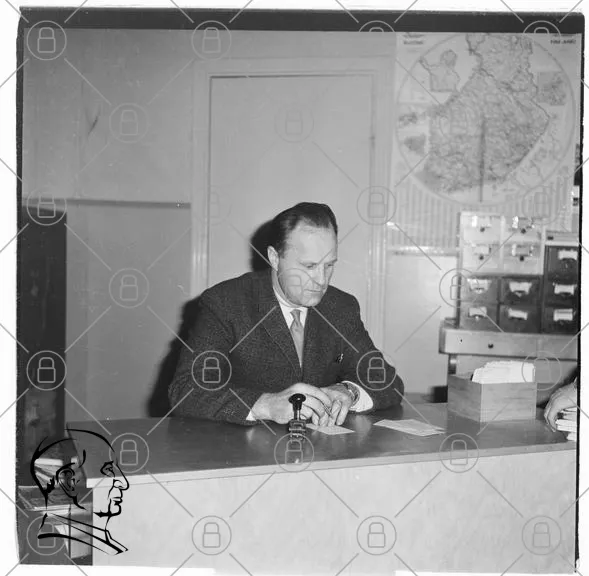man, kontor, skrivbord, stämpel, dokument, karta, förvaring, lådor, svartvitt, 1900-tal, affärsmannaklädsel, inomhus, arbete, administration, historisk, professionell, seriös, kontorsmiljö, papper, kontorsutrustning
