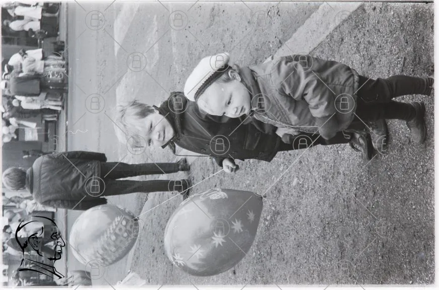 barn, ballonger, svartvit, lek, utomhus, glädje, vänner, kläder, 1960-tal, barndom, skratt, fotografering, park, fest, tradition, minnen, familj, nöje, sommar, lekplats