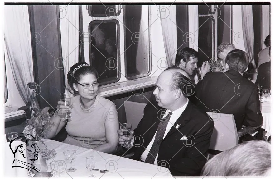 fest, middag, glas, skål, klänning, kostym, 1960-tal, båt, sällskap, leende, bord, fönster, svartvitt, elegans, socialt, samvaro, kvinnor, män, dekoration, mat, dryck, festligheter, minnen, retro, stil, interiör, vänskap, skratt, samtal, festmåltid