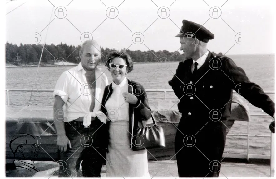 båt, hamn, människor, svartvitt, 1950-tal, kläder, leende, man, kvinna, polis, sjö, sommar, solglasögon, handväska, skjorta, byxor, hatt, fotografi, nostalgi, vänskap, utomhus