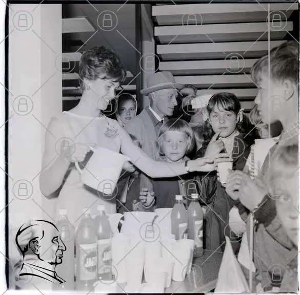 fest, barn, dryck, servering, kvinna, leende, glas, samling, 1960-tal, socialt, evenemang, familj, tradition, festligheter, kläder, interiör, trappa, glasyr, mjölk, läsk, aktivitet, gemenskap, glädje, minnen, nostalgisk, fotografering, vuxna, barnslig, skratt, samvaro