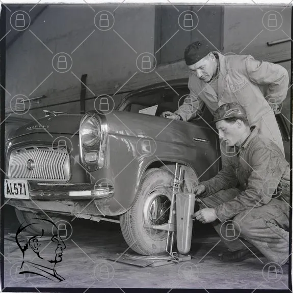bil, mekaniker, verkstad, däck, reparation, 1950-tal, arbete, verktyg, maskin, man, teknik, gammal bil, underhåll, hjul, motor, garage, professionell, industri, service, mekanisk, arbete i grupp, historisk, svartvitt, fordon, bilservice, bilreparation, mekanisk arbete, däckbyte, bilverkstad, hantverk