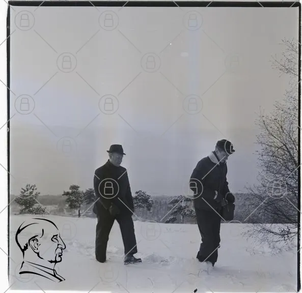 snö, vinter, män, promenad, träd, landskap, hatt, kläder, natur, fotspår, kallt, svartvitt, stillhet, friluftsliv, skog, avstånd, ensamhet, lugn, tradition, gammaldags, utflykt, vandrare, snötäckta, himmel, skandinavisk, retro, fotografi, minnen, historia