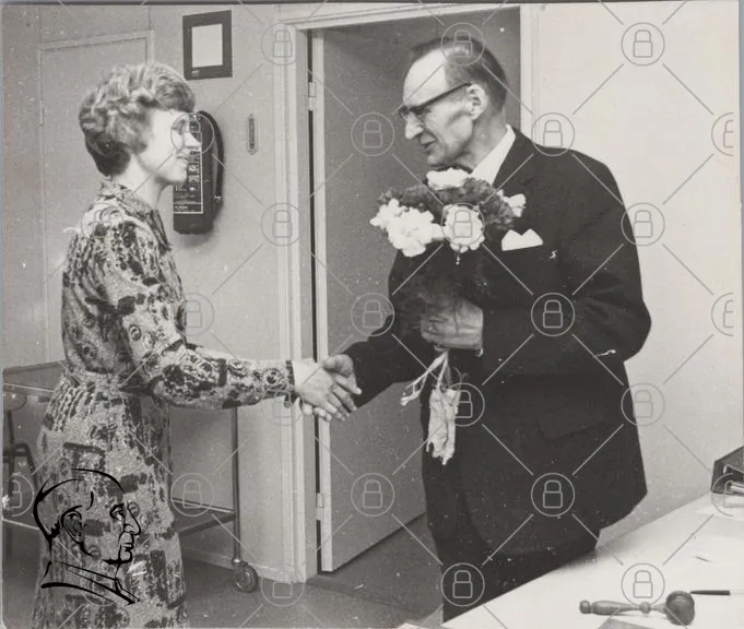 handshake, blommor, kvinna, man, gammal bild, sjukhus, kontor, kläder, 1900-tal, svartvitt, interiör, vänskap, firande, möte, leende, tradition, artighet, gest, relation, professionell, historia, kultur, socialt, minne, nostalgi, samarbete, respekt, känslor, ögonkontakt, presentation