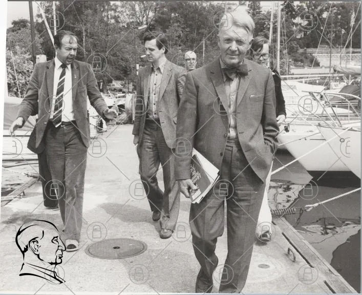 svartvitt, män, promenad, kaj, båtar, kläder, kostymer, slips, böcker, 1980-tal, trä, hamn, grupp, diskussion, ansiktsuttryck, fotografi, historiskt, utomhus, stil, samarbete, ledarskap, vänskap, möte, natur, vatten, landskap, arkitektur, tradition
