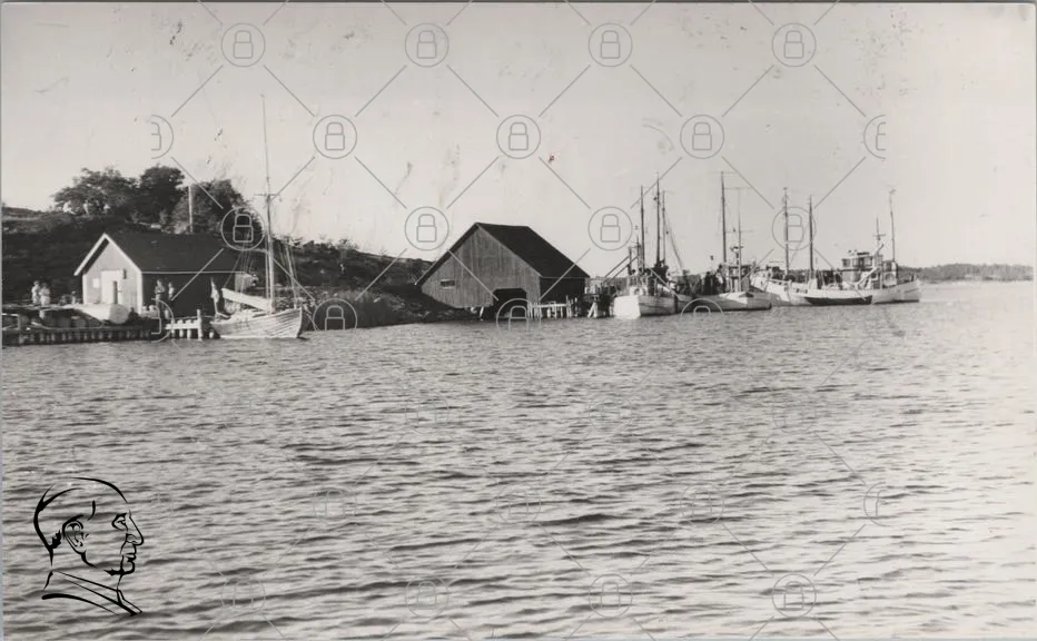 båtar, sjö, vatten, brygga, skog, byggnad, himmel, segelbåt, träbåt, kust, hamn, kaj, landskap, svartvitt, gammal, historisk, skärgård, fiske, båthus, natur