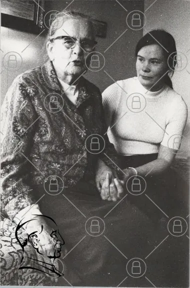 två kvinnor, gammal kvinna, ung kvinna, svartvitt foto, porträtt, sittande, händer, ansiktsuttryck, kläder, inomhus, generationer, relation, samtal, närhet, känslor, tradition, historia, familj, minnen, livserfarenhet, kultur