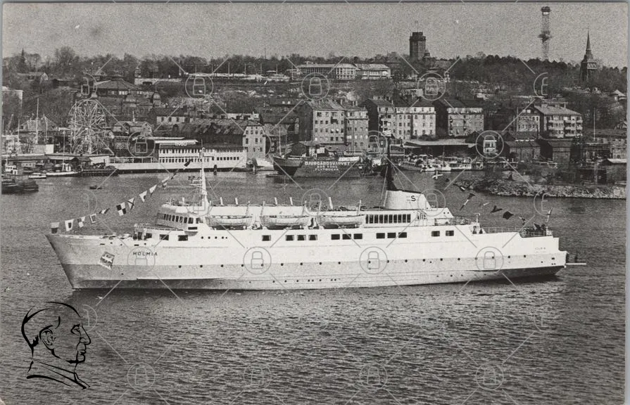 fartyg, Holmia, hamn, vatten, byggnader, svartvitt, båtar, kaj, stad, landskap, segel, flaggor, historia, transport, sjöfart, 1900-tal, turism, resor, skärgård, Sverige