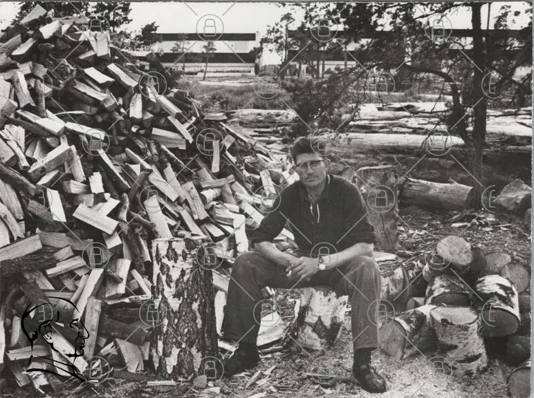 ved, vedstapel, man, skog, trä, natur, arbete, landskap, 1900-tal, svartvitt, kläder, glasögon, avkoppling, utomhus, tradition, hantverk, miljö, sommar, jordbruk, livsstil