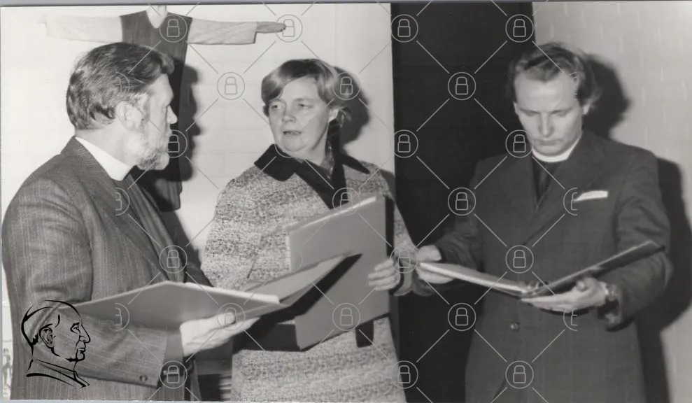 svartvit, människor, diskussion, dokument, kläder, 1960-tal, inomhus, porträtt, konst, samarbete, presentation, uttryck, gestikulation, möte, professionell, interaktion, ansiktsuttryck, grupp, information, papper