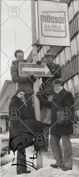 skylt, pil, män, vinter, kläder, byggnader, svartvitt, 1970-tal, stad, fotografering, grupp, humor, riktning, gata, bank, snö, mössor, handskar, leende, traditionell, retro, arkitektur, samhälle, vänskap, utomhus, samling, ansikten, gest, stil, historia