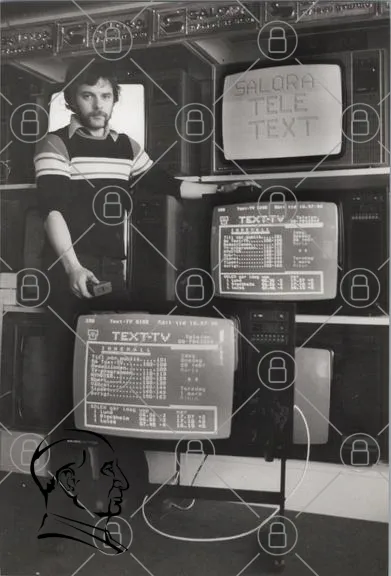 man, tv, skärm, text, teletext, vintage, teknik, dator, 1980-tal, svartvitt, kontroll, information, program, meddelande, retro, elektronik, kommunikation, nyheter, underhållning, visning, bildskärm, kabel, sändning, användare, hobby, nostalgisk, apparat, medie, visuell, interaktion