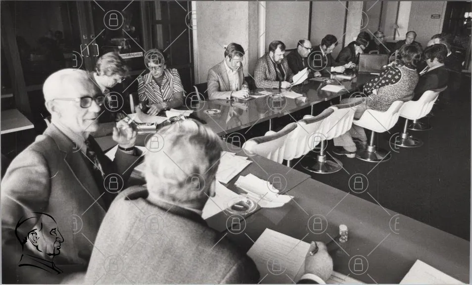 möte, konferens, bord, personer, dokument, anteckningar, skrivande, glasögon, kostymer, 1970-tal, svartvitt, inomhus, diskussion, affärsmän, kontor, stolar, papper, cigarett, telefon, professionellt, samarbete, grupp, ledarskap, presentation, fokus, arbetsmiljö, team, strategi, beslut