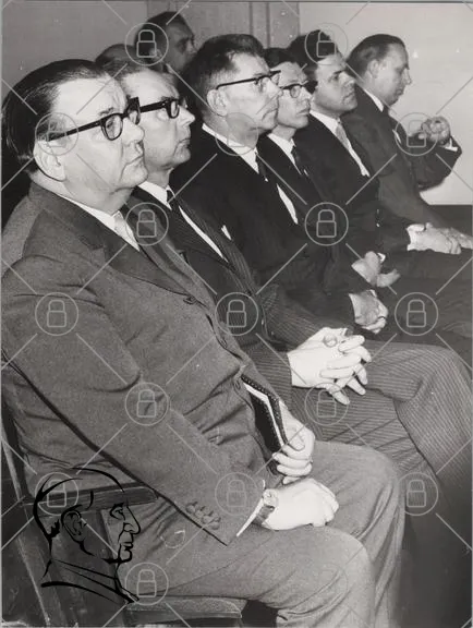 svartvitt, män, kostymer, glasögon, möte, sittande, formella kläder, 1960-tal, grupp, allvarliga, inomhus, ansiktsuttryck, diskussion, professionella, kontorsmiljö, historisk, retro, stil, samling, presentation