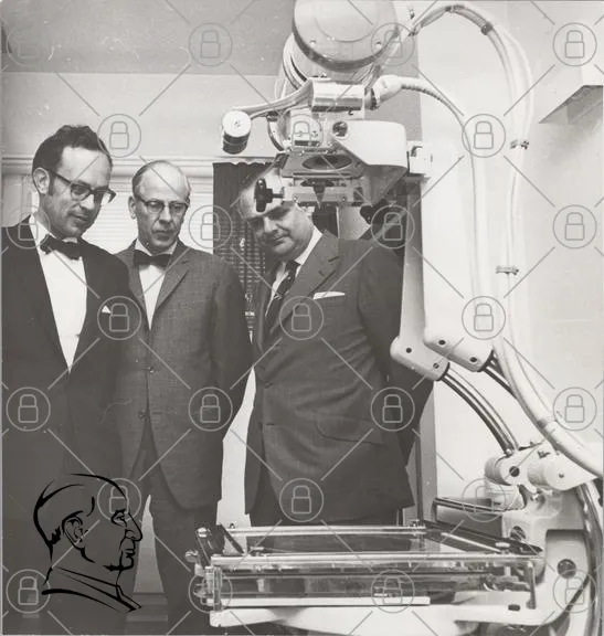 tre män, kostymer, glasögon, teknik, medicinsk utrustning, laboratoriemiljö, forskning, 1960-tal, svartvitt foto, diskussion, innovation, vetenskap, professionella, medicin, optik, mikroskop, utrustning, experiment, analys, medicinsk forskning