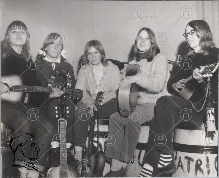 fem tjejer, musik, gitarrer, svartvitt, 1970-tal, ungdomar, band, sång, instrument, kläder, leenden, sittande, retro, fotografi, kultur, vänskap, kreativitet, scen, underhållning, nostalgi, gemenskap