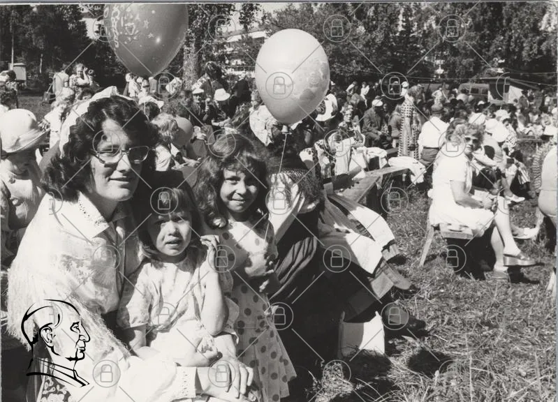 familj, barn, fest, ballonger, utomhus, människor, samling, svartvitt, kläder, leende, glädje, picknick, träd, gräs, sommar, aktiviteter, tradition, gemenskap, fotografering, minnen
