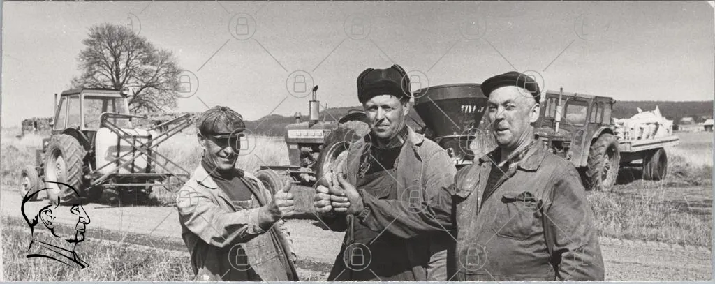 män, arbetare, jordbruk, traktor, landskap, svartvitt, 1950-tal, kläder, verktyg, tummen upp, samarbete, maskiner, fält, traditionell, rural, historia, fotografering, leende, gemenskap, arbete, industri, landsbygden, jordbruksmaskiner, mänsklig aktivitet, nostalgi, teamwork, utomhus, natur, vintage, kultur