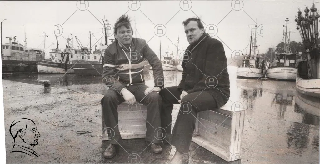 män, båt, hamn, svartvitt, kläder, trä, sittande, vind, fiske, båtar, 1900-tal, porträtt, vänner, utomhus, natur, sjö, träkista, ansikten, stil, nostalgi