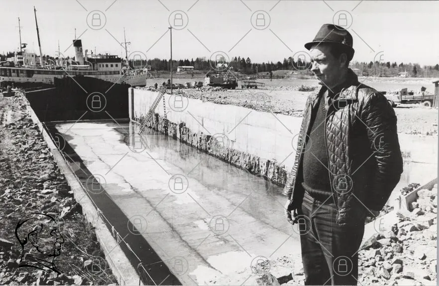 man, båt, hamn, byggarbetsplats, vatten, kaj, svartvit, landskap, industri, konstruktion, träd, himmel, fartyg, kanal, arbete, utrustning, sten, betong, väg, lastbil