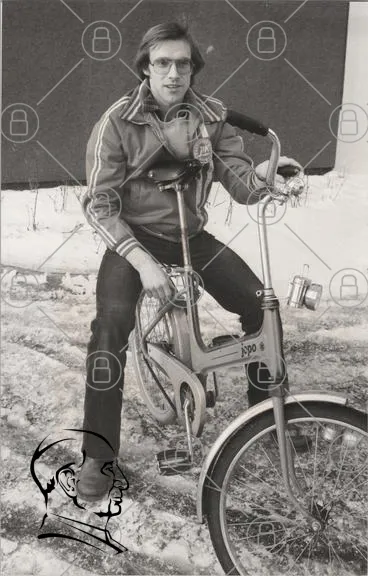 man, cykel, snö, vinter, jacka, byxor, retro, jopo, barn, lek, 1970-tal, svartvitt, utomhus, sport, ungdom, stil, nostalgi, fotografering, landskap, cykeltillbehör