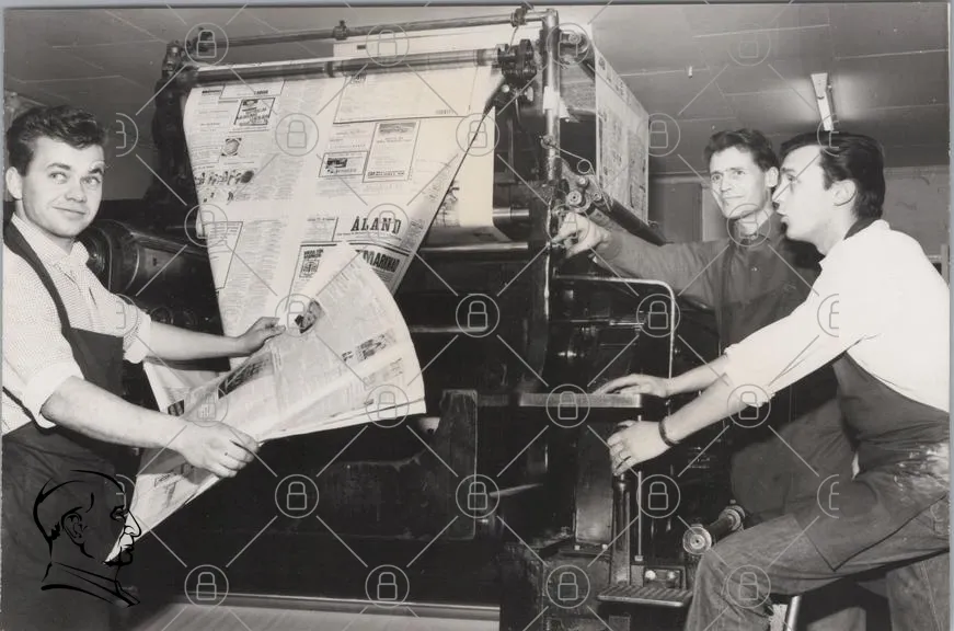 tryckpress, tidningar, tryckning, journalister, arbete, historisk, svartvitt, papper, maskin, nyheter, publicering, press, redaktion, medieproduktion, 1900-tal, industri, teknik, kommunikation, pressrum, tryckerikultur
