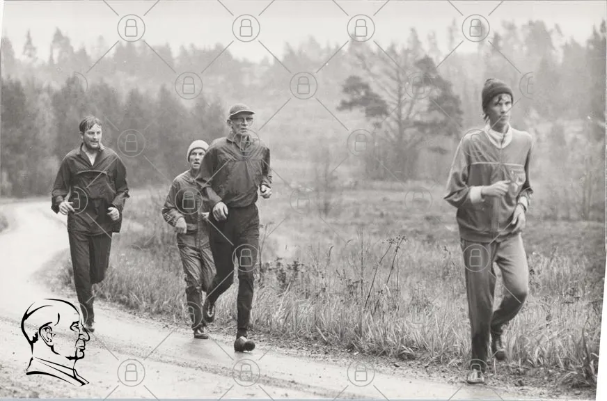 löpare, jogging, skog, grusväg, regn, träning, motion, män, kläder, sport, natur, svartvitt, utomhus, hälsa, aktivitet, landskap, gemenskap, 1970-tal, retro, fotboll, joggingkläder, löpning, fitness, väder, stil, tradition, samarbete, uthållighet, sportevenemang