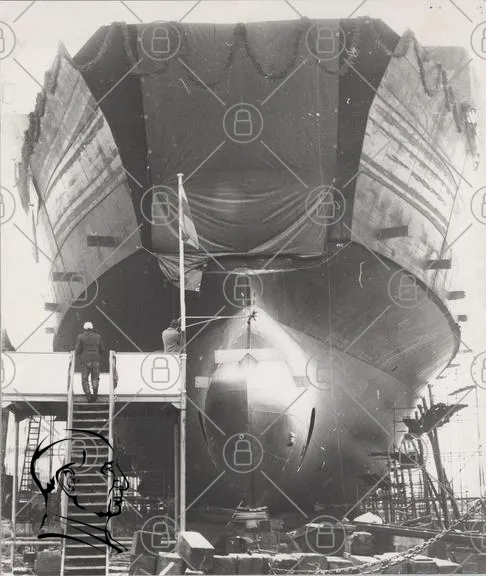 båt, skepp, varv, byggnation, män, trappa, flagga, svartvitt, industri, konstruktion, marina, fartyg, arbete, historia, teknik, sjöfart, stålkonstruktion, lastfartyg, docka, sjösättning