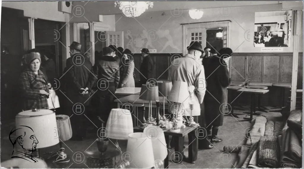 svartvitt, människor, inomhus, möbler, lampor, hattar, kläder, retro, 1960-tal, samling, interiör, bord, väggkonst, belysning, socialt, stil, vintage, butik, evenemang, diskussion, nostalgisk, atmosfär, grupp, stående, sittande, föremål, dekoration, rum, stilren, traditionell