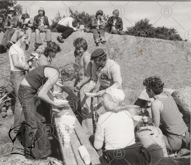 fest, picknick, människor, mat, dryck, utomhus, 1970-tal, samling, bänkar, kläder, skratt, socialt, natur, gemenskap, aktiviteter, tallrikar, koppar, soligt, avslappnat, ungdomar, tradition, roligt, vänner, samvaro, minnen, fotografering, avslappning, glädje, kultur, fritid