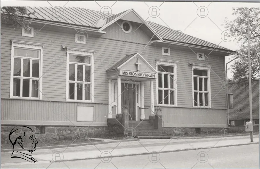 missionskyrkan, byggnad, kyrka, entré, trappa, fönster, tak, kors, grå, trä, samhälle, religiös, arkitektur, historisk, exteriör, svensk, landsbygd, kultur, gemenskap, tradition, svartvit, fotografi, stil, design, lokal, plats, verksamhet, samling, tro, andakt