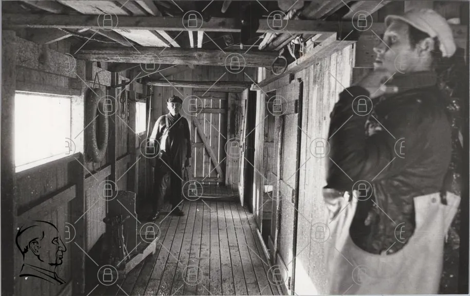 fiskebåt, interiör, svartvit, man, kläder, trä, dörrar, fönster, verktyg, sjöman, gammal, traditionell, hantverk, belysning, takbjälkar, golv, atmosfär, historia, marin, livsstil