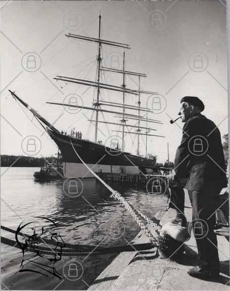 skepp, segelbåt, hamn, man, pipa, träbåt, mast, vatten, kaj, rep, svartvitt, gammal, marin, segling, landskap, båtliv, historia, tradition, sjöfart, ankar, brygga