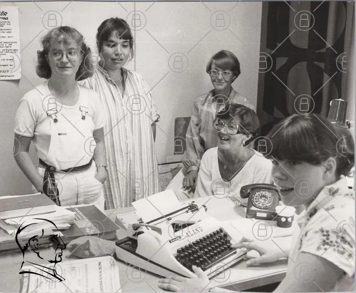 svartvit, kvinnor, skrivmaskin, kontor, 1980-tal, glasögon, papper, telefon, leende, arbete, mode, retro, grupp, interiör, dokument, skrivbord, tidningar, kontorsmiljö, vänskap, samarbete, kreativitet
