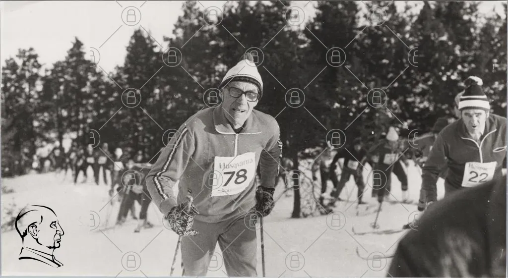 skidåkning, vinter, snö, tävling, nummerlapp, 78, glasögon, mössa, träd, sport, man, retro, svartvitt, friluftsliv, skidutrustning, motion, natur, aktivitet, glädje, gemenskap, tradition, Husqvarna