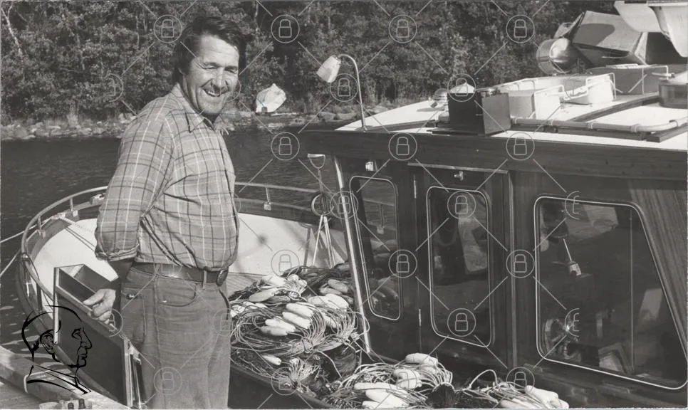 man, båt, fiske, nät, sjö, natur, skog, svartvitt, leende, fiskeutrustning, sommar, tradition, handarbete, fritid, utomhus, vatten, rekreation, hantverk, landskap, nostalgi
