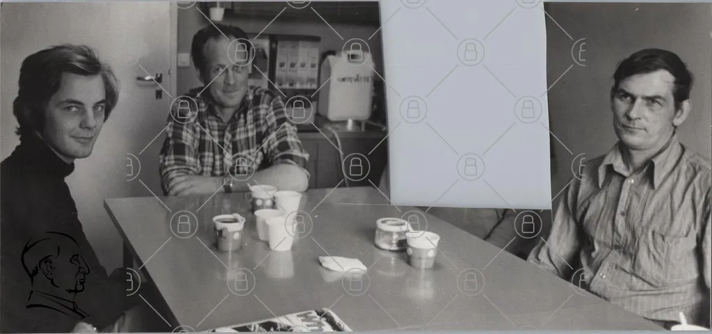 man, bord, glas, mjölk, plastkoppar, rutigt, skjorta, inomhus, leende, dryck, tidning, kontor, kaffemaskin, mat, snacks, 1980-tal, svartvitt, retro, avslappnad, social, samvaro, miljö, vardag, fika, gemenskap, diskussion, atmosfär, nostalgisk, enkelhet