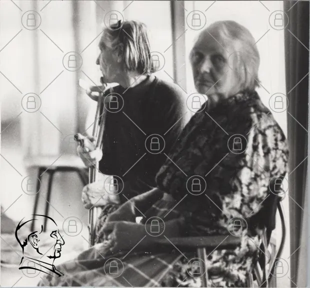 två kvinnor, äldre, svartvitt, inomhus, stolar, rullator, kläder, ansiktsuttryck, fönster, ljus, stillhet, ensamhet, interiör, gammal, tidlös, fotografi, nostalgi, sittande, blickar, detaljer, livserfarenhet, minnen, sårbarhet, åldrande, relationer, känslor, historia, kultur, samhälle, reflektion