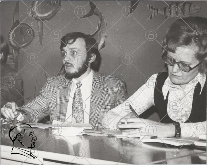 svartvitt, möte, män, kvinnor, kläder, kostym, skjorta, papper, bord, diskussion, 1970-tal, retro, ansiktsuttryck, inomhus, skrivbord, anteckningar, mikrofon, bakgrund, väggkonst, fiskar, vintage, stil, professionell, allvarlig, samarbete, kommunikation, presentation, grupp, interaktion