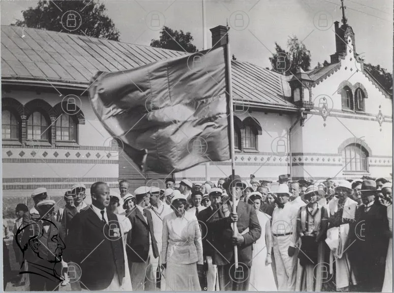 flagga, människor, historisk, samling, kläder, svartvitt, ceremoni, byggnad, tradition, fest, ledare, grupp, utomhus, 1900-tal, uniform, kvinnor, män, nationalitet, kultur, minne, evenemang, fotografering, gemenskap, patriotism, historia, representation, festlighet, symbol, identitet, samhälle