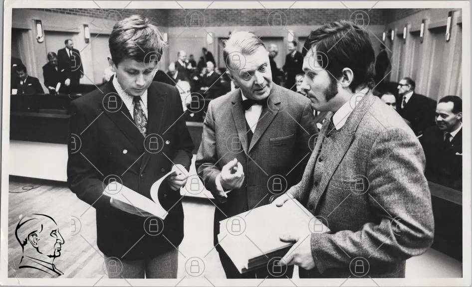 män, diskussion, böcker, kläder, 1970-tal, svartvitt, konferens, akademisk, samtal, publik, kostym, slips, dokument, intellektuell, möte, forskning, utbildning, stil, ansiktsuttryck, gestikulera, grupp, interaktion, manliga, professionell, traditionell, samarbete, presentation, information, lärande, studier