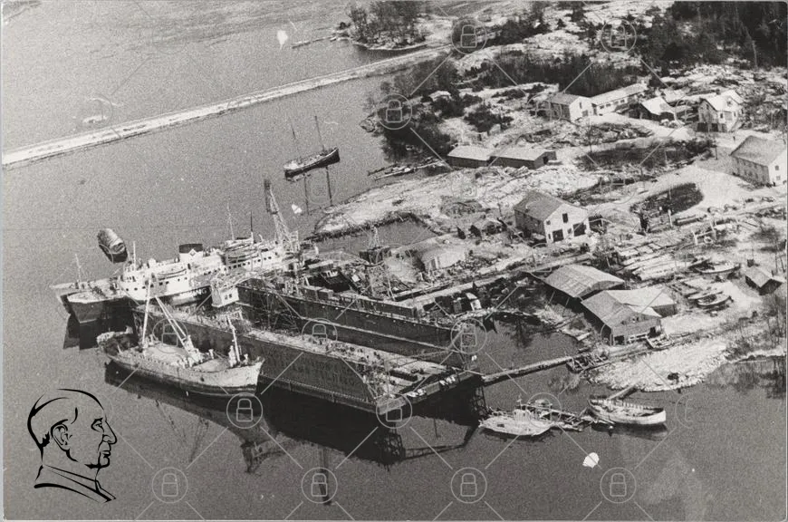 båt, skepp, hamn, vatten, byggnader, träd, landskap, industri, brygga, fartyg, kaj, transport, svartvit, natur, anläggning, sjöfart, last, marina, öar, flygbild, historia, arbetsplats, fordon, kajplats, sjö, lastning, lastbil, verkstad, utrustning