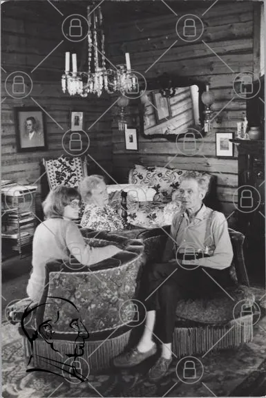 inredning, gammal, stuga, möbler, familj, svartvit, väggar, porträtt, bord, stolar, lampa, soffa, traditionell, interiör, vintage, hem, människor, samtal, historia, kultur, landsbygd, 1900-tal, hemtrevligt, nostalgiskt, trä, dekoration, ljuskrona, kuddar, tyg, fotografi