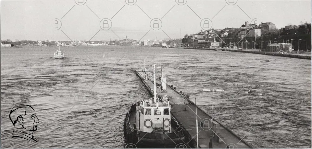 båt, kaj, vatten, hamn, svartvit, landskap, byggnader, brygga, transport, sjöfart, stad, vy, moln, reflektion, stilla, industri, fartyg, kajplats, skärgård, Sverige, historia, gammal, foto, panoramavy, kust, sjö, navigering, båtliv, hamnliv, stadsmiljö