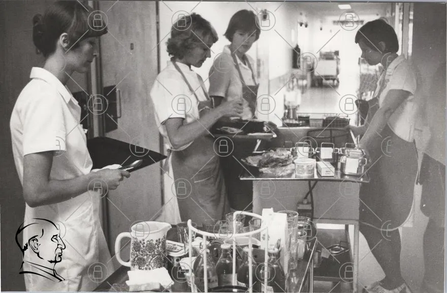 sjukhus, personal, mat, servering, kök, sjuksköterskor, arbete, 1980-tal, svartvitt, brickor, drycker, kläder, sjukvård, miljö, samarbete, matlagning, vård, patienter, service, professionellt, utrustning, hygien, arbetsplats, tradition, teamwork, kvinnliga, yrke, matservering, sjukhusmiljö, historisk